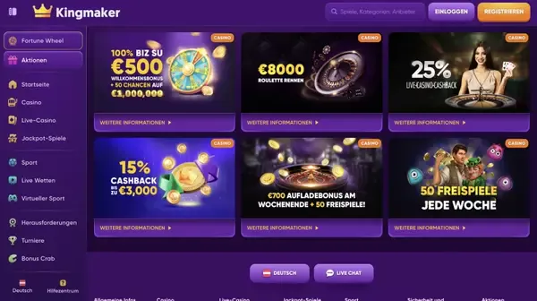 Über die erste Einzahlung hinaus rotieren laufende Angebote, die unterschiedliche Spielgewohnheiten über die Woche unterstützen können. Einige Deals konzentrieren sich auf zusätzliche Freispiele, andere erhöhen den Match-Bonuswert für Wochenendspiel. Cashback ist ebenfalls innerhalb des angegebenen Caps verfügbar und kann helfen, die Varianz über die Zeit zu reduzieren. Jede Promo hat eigene Regeln – öffnen Sie daher die Aktionsdetails, bevor Sie teilnehmen, um Umsatzanforderungen, teilnahmeberechtigte Spiele und die Anspruchsschritte für jeden Kingmaker Bonus zu sehen.