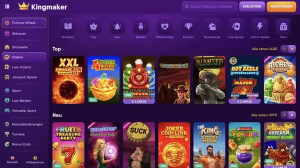Unser Slot-Bereich umfasst klassische Formate und feature-lastige Neuerscheinungen, mit tausenden verfügbaren Optionen. Wenn Sie nach Kingmaker Spielautomaten suchen, finden Sie Spiele mit unterschiedlichen Mechaniken wie expandierenden Walzen, Bonuskäufen (wo erlaubt) und mehrstufigen Freispiel-Runden. Wir verstecken die Grundlagen nicht: Sie können das Info-Panel öffnen, um den angezeigten RTP, die Einsatzspanne und die Regeln zu sehen, bevor Sie drehen. Für Spieler, die höheres Gewinnpotenzial mögen, weisen viele Titel ihren Maximalgewinn und Bonusregeln direkt in der Auszahlungstabelle aus, sodass Sie sie schnell vergleichen können. Hier finden Sie auch Casino Kingmaker Spielautomaten, die in unseren rotierenden Empfehlungen und Turnieren erscheinen.